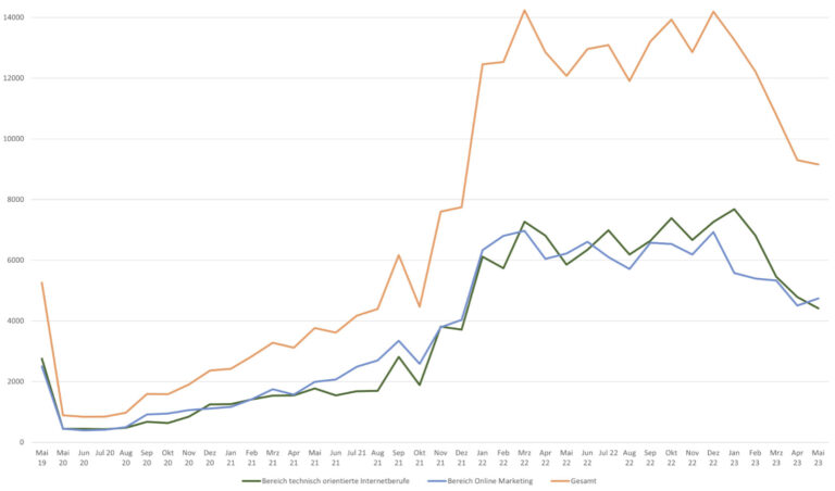 Die Entwicklung der Nachfrage auf dem deutschen Arbeitsmarkt für Online-Marketing-Berufe und technisch orientierte Internetberufe vom Mai 2019 bis Mai 2023